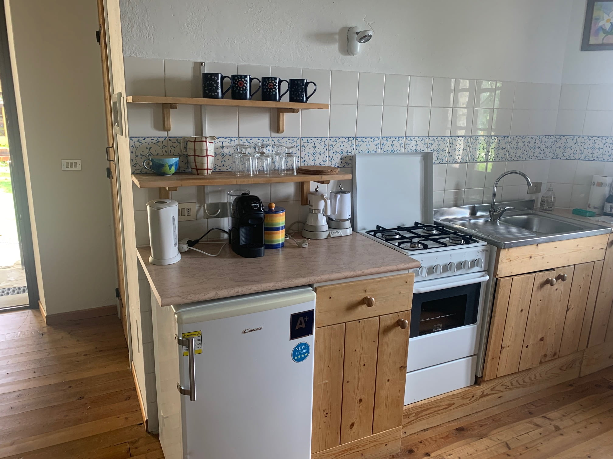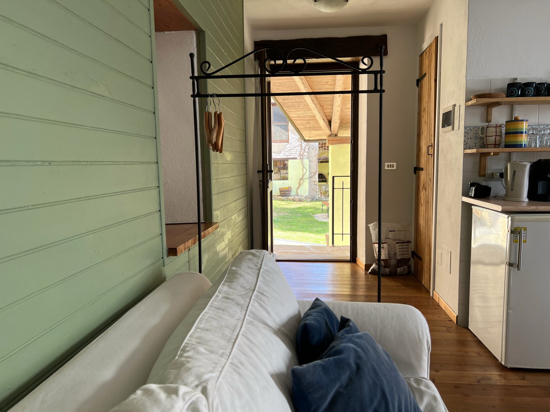 Cozy and complete apartment on the ground floor, located on the beautiful valley. Equipped with a kitchen/dining room (with a sofa bed for 1 or 2 people), bathroom with shower, toilet and sink and a spacious separate bedroom with a double bed. The apartment has a private patio in the courtyard. The kitchen is equipped with a 4-burner gas stove, a refrigerator and an oven. Coffee can be made with a Lavazza coffeemaker
